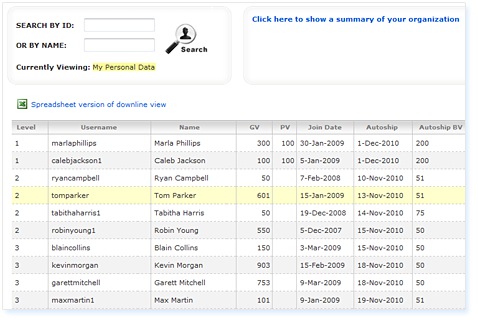 Every column header allows the data to be sorted alphanumerically. If a member wanted to view their downline by the Join Date criteria they would simply click on the Join Date column header and their data redisplays instantly. Additionally, every row highlights on mouse over helping members zero in on their key people.